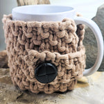 Introducing the Macrame Coffee Mug Cozy - the perfect way to keep your coffee hot and your style cool. Crafted with high quality organic and sustainable cotton cord, this cozy is made to last. Each cozy is uniquely knotted in a variety of patterns with a vintage button, ensuring you'll have a one-of-a-kind accessory for your standard 11 oz mug. Say goodbye to nylon yarn and hello to a cozy with personality!