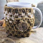 Introducing the Macrame Coffee Mug Cozy - the perfect way to keep your coffee hot and your style cool. Crafted with high quality organic and sustainable cotton cord, this cozy is made to last. Each cozy is uniquely knotted in a variety of patterns with a vintage button, ensuring you'll have a one-of-a-kind accessory for your standard 11 oz mug. Say goodbye to nylon yarn and hello to a cozy with personality!