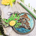 Behold the whimsical beauty of our Frog and Mushroom Keychain, a tiny treasure handcrafted with love and care. Delicately painted on both sides to showcase the charming details of a colorful frog perched beside a vibrant mushroom. Made from locally sourced American hardwood, this enchanting piece not only captures the essence of nature but also supports sustainable practices. Carry a piece of woodland magic with you wherever you go with our Frog and Mushroom Keychain, a delightful accessory that promises to add a touch of wonder to your daily adventures.