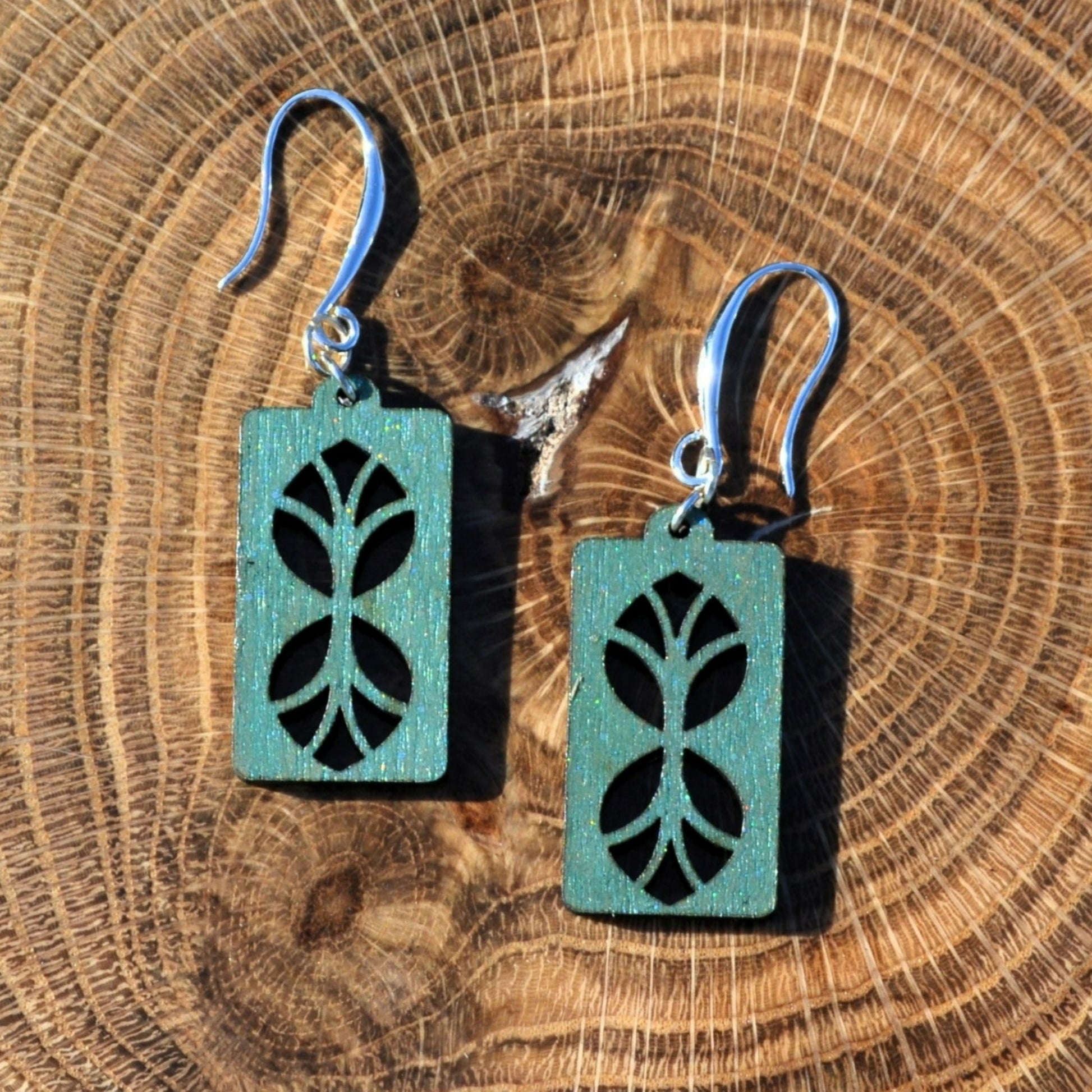Elevate your style with our handcrafted as above so below wood dangle earrings in teal. Made with ethically sourced hardwoods and hypoallergenic hardware, these unique earrings are a stunning addition to any outfit. Discover the perfect blend of sustainability and fashion with our artisan-crafted earrings.