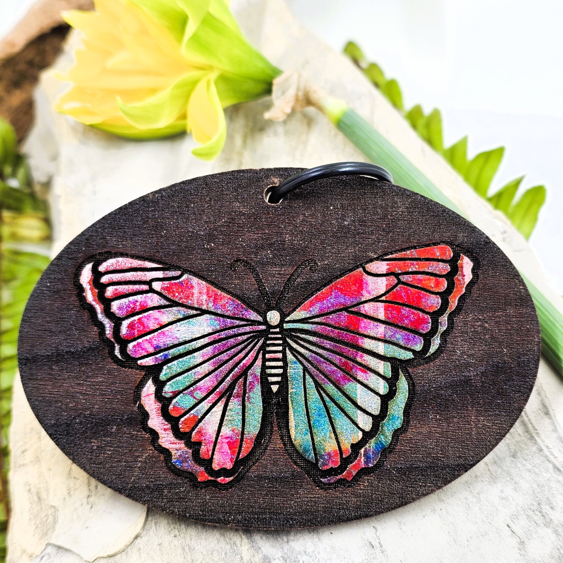 Introducing our stunning multicolored butterfly keychain, a true work of art crafted from reclaimed local American hardwood. Each keychain is a unique masterpiece, showcasing a vibrant array of colors that mimic the breathtaking hues of a butterfly's wings. The high-quality keychain hardware ensures durability and functionality, making it both a beautiful accessory and a practical tool for keeping your keys organized. Add a touch of nature-inspired beauty to your daily routine with our one-of-a-kind butterfly keychain.