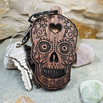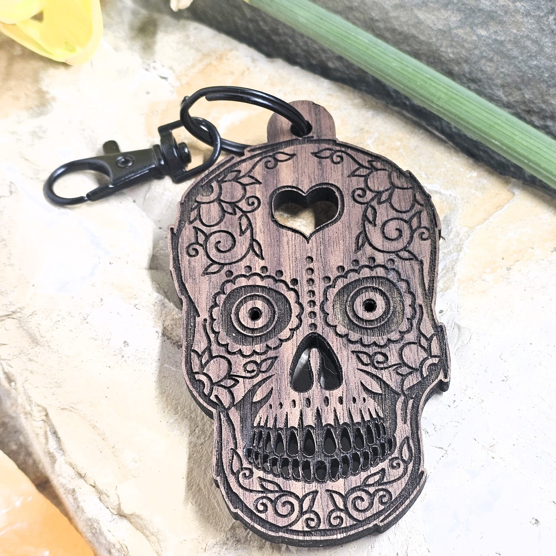 Introducing our stunning Calavera (Sugar Skull) keychain, handcrafted from locally sourced American walnut that fell during a powerful storm. Each keychain is a unique piece of art, showcasing the intricate details of a traditional sugar skull design on the rich, dark wood. This keychain not only adds a touch of elegance to your everyday essentials but also carries a story of resilience and beauty from nature's own hand. Carry a piece of history and craftsmanship with you wherever you go with our Calavera keychain.