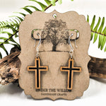Elevate your style with our cross dangle earrings. Handcrafted from locally sourced American butternut wood, these earrings feature a stunning cross cutout design. With hypoallergenic hardware, everyone can enjoy these sophisticated and exclusive earrings. Complete your look with a touch of elegance and luxury.