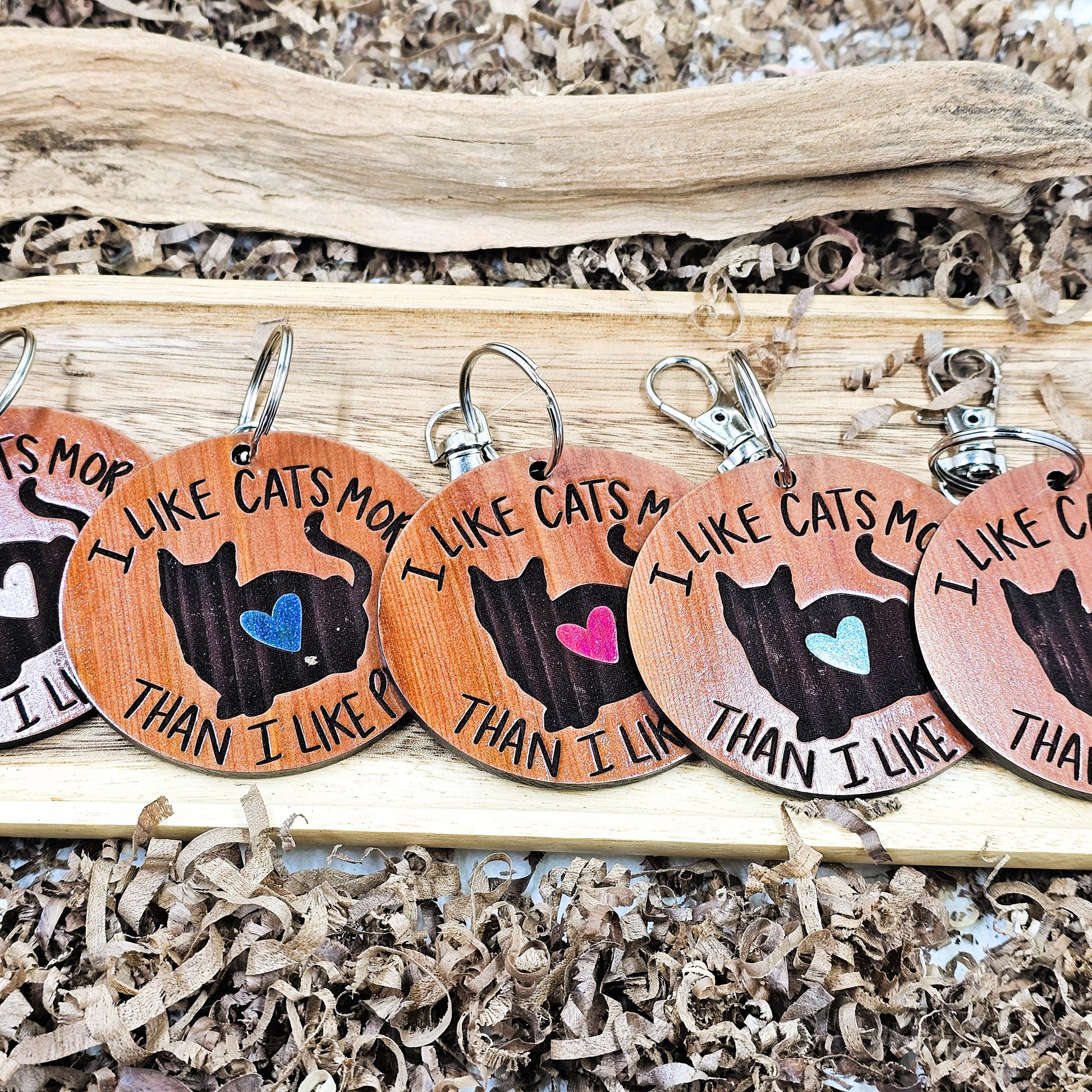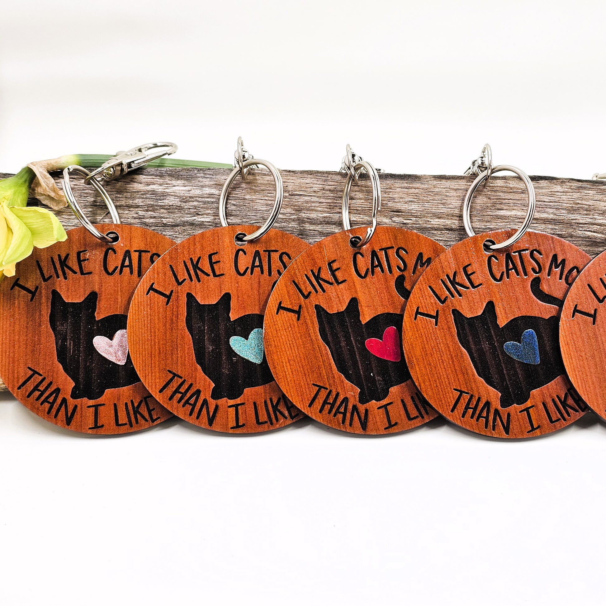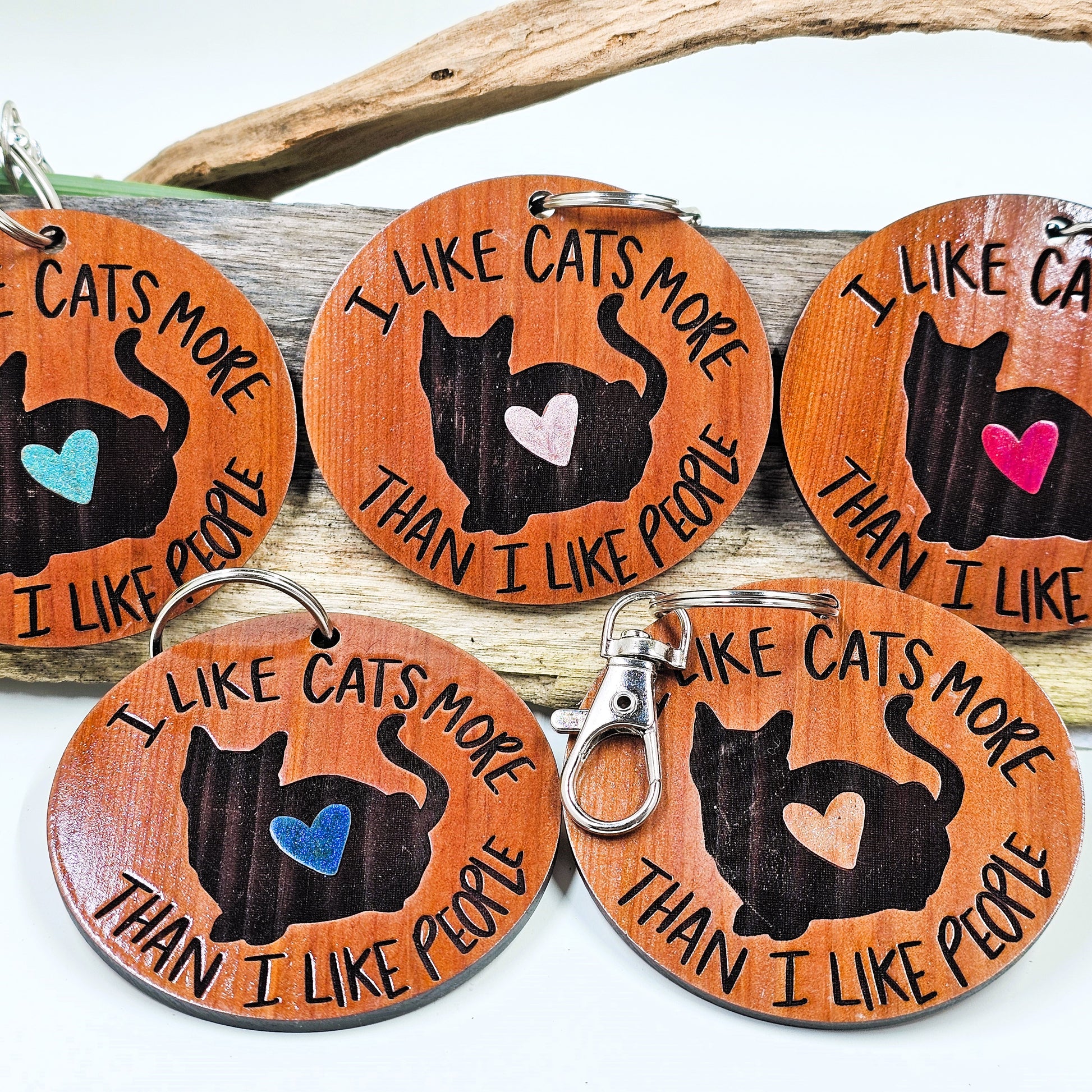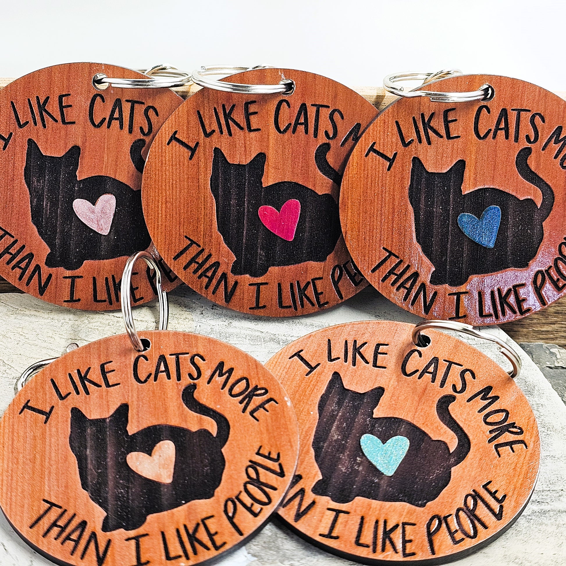 Introducing our purr-fectly delightful "I Like Cats More Than I Like People" keychain! Hand-painted on local cedar with love (and maybe a sprinkle of catnip), this keychain is the ideal accessory for all feline enthusiasts. Choose your heart color to match your mood - whether you're feeling "paws-itively" pink or "fur-ociously" red. Let your keys declare your loyalty to our whiskered overlords in style, because let's face it, cats rule and people drool!