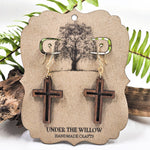 Elevate your style with our cross dangle earrings. Handcrafted from locally sourced American walnut wood, these earrings feature a stunning cross cutout design. With hypoallergenic hardware, everyone can enjoy these sophisticated and exclusive earrings. Complete your look with a touch of elegance and luxury.