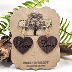 Add a touch of love to your everyday style with our Heart Dangle Earrings. Made with American walnut wood and hypoallergenic hardware, these earrings are perfect for those with sensitive ears. The heart-shaped design is inscribed with the word "love", making them a sweet and thoughtful gift.