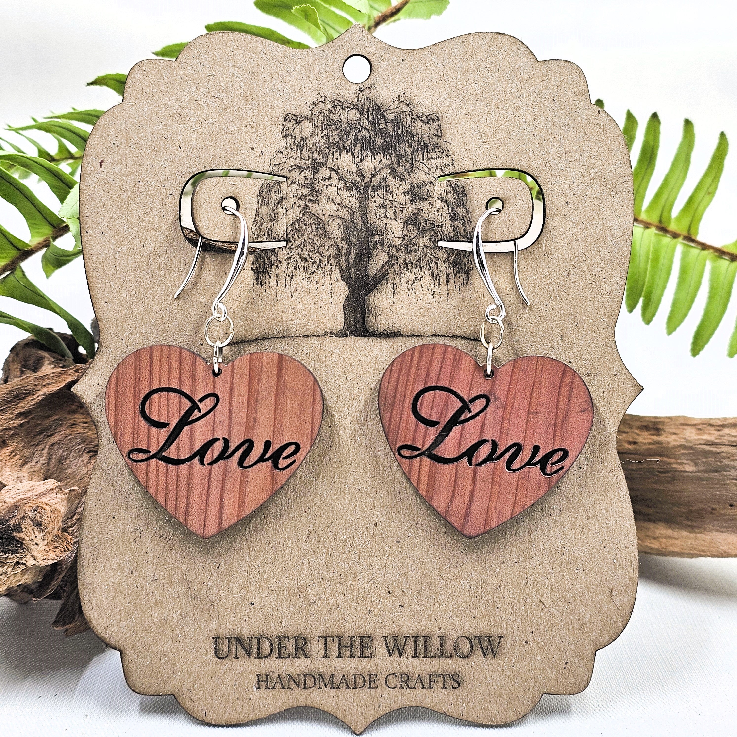 These love engraved heart dangle earrings are handcrafted with locally sourced cedar wood, making each pair unique. The hypoallergenic hardware ensures comfort for those with sensitive skin. Perfect for showing off your love for nature in style.