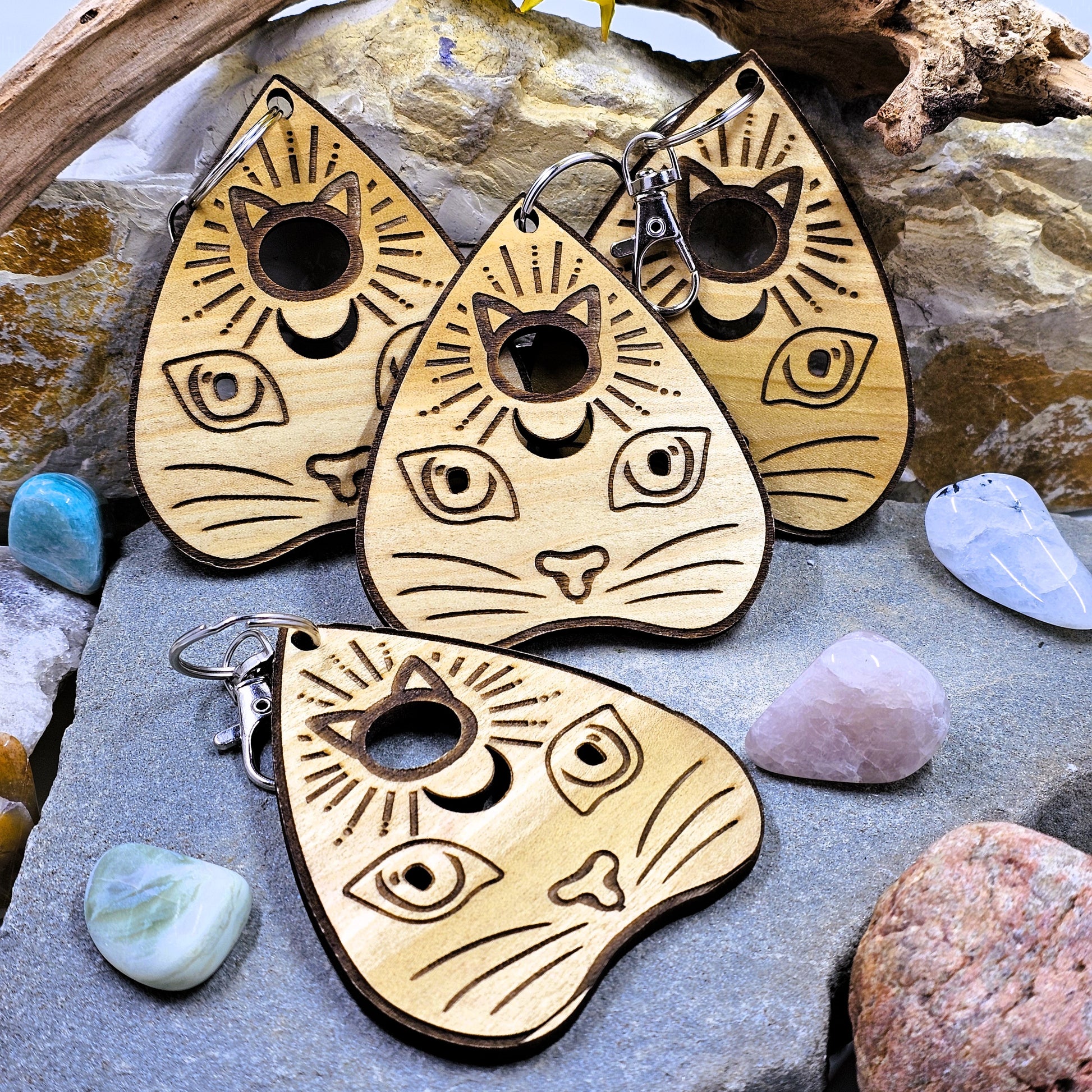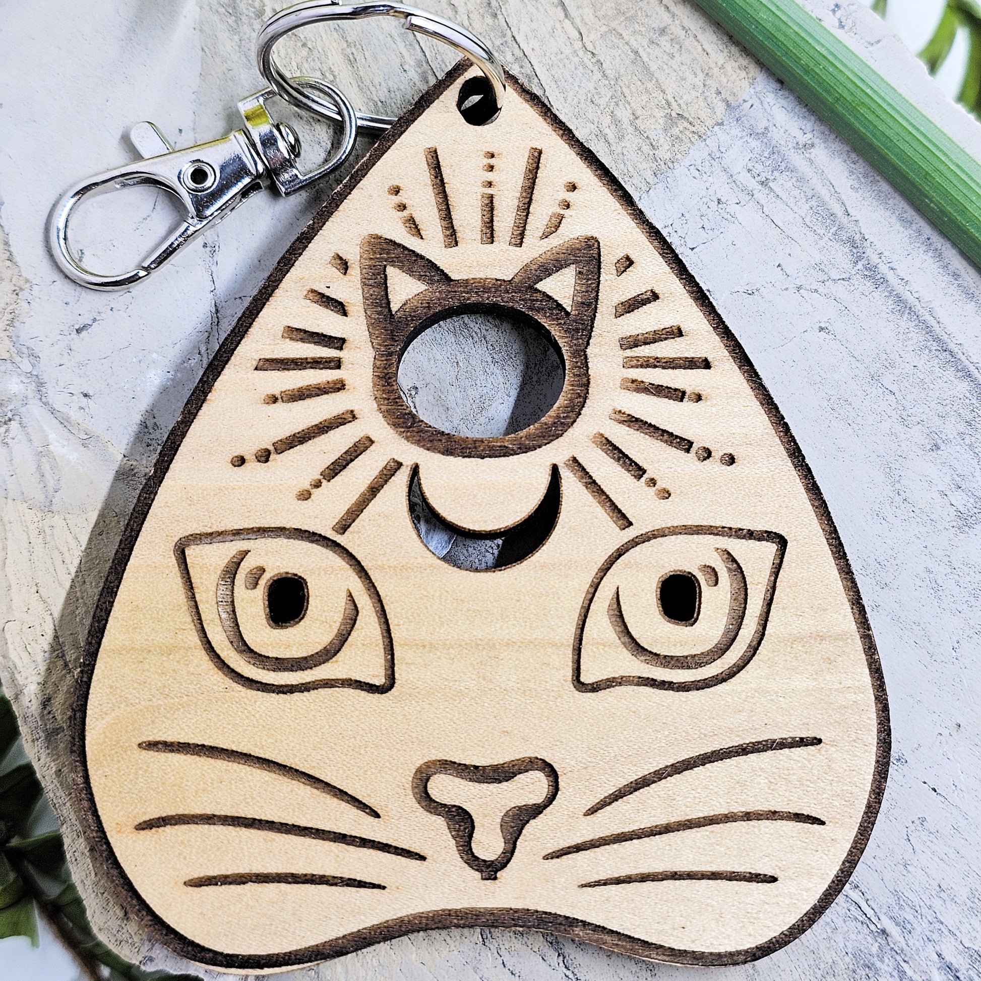 Behold the enchanting Ouija Cat Keychain, a mystical talisman crafted from local reclaimed poplar wood, imbued with ancient energies and whispered secrets. This ethereal feline guardian, with its mesmerizing design etched into the wood, serves as a conduit between the physical realm and the spirit world. Carry this bewitching keychain with you and allow its mystical aura to guide and protect you on your journey through the unknown. Let the whispers of the Ouija Cat Keychain lead you to hidden truths and unlock the mysteries that lie within.