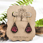 Spice up your style with our Rose Dangle Earrings! Made from American hardwood and hypoallergenic hardware, these earrings are not only environmentally friendly, but also safe for sensitive ears. The charming pink rose design is accented with a touch of rainbow glitter for added fun.