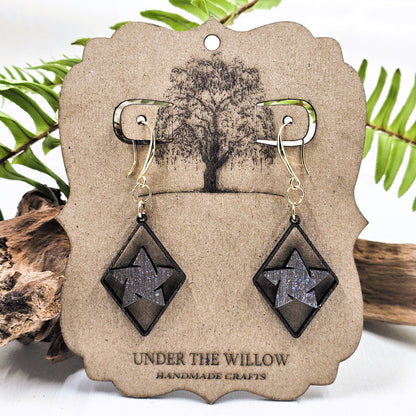 Add a touch of whimsy to your outfit with our Star Dangle Earrings! Crafted from beautiful American hardwood, these earrings feature hypoallergenic hardware, silver stain, and a stunning rainbow glitter finish. Perfect for any occasion, these earrings are sure to make you shine (literally)!
